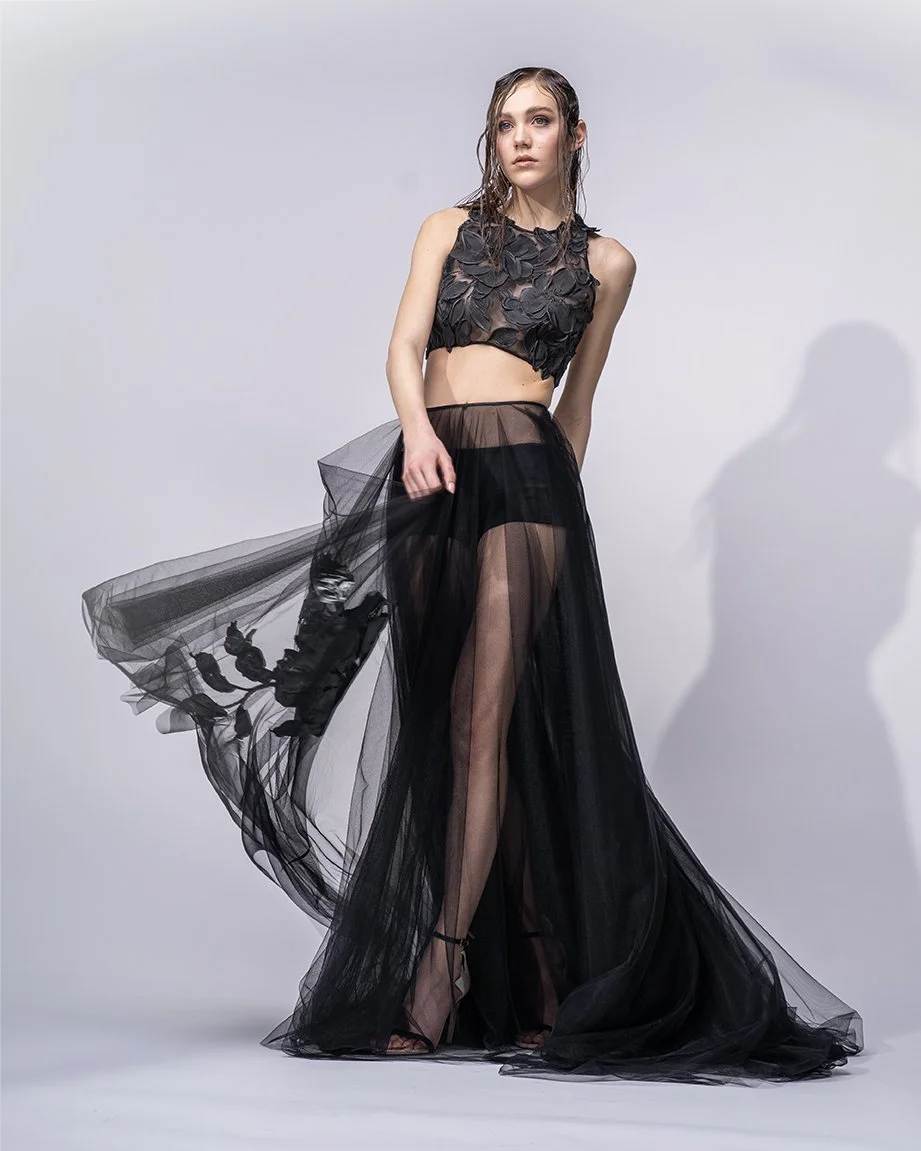 The dresses photographed are size 40. Worn by models with a height of approximately 176 cm, bust 80 cm, waist 60 cm, hips 90 cm and wearing a 110 cm heel.